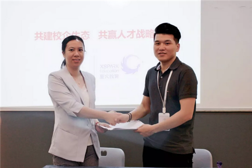 在星火教育南宁分公司的领导层带领下,我校代表首先参观了星火教育澳门街校区,对校区的工作环境进行了简单的了解。在座谈会上,星火教育南宁分公司总经理叶健锋老师详细介绍了星火教育目前的发展状况,并对校区工作环境、教研、师资选聘和培训等体系做了详细的介绍。在签约仪式现场,我院党委副书记陶剑飞代表学院与星火教育南宁分公司总经理叶健锋老师签署实习实践基地协议书,并进行授牌仪式。双方表示非常期待接下来的合作,希望未来有越来越多优秀的毕业生加入星火教育,也希望星火教育能定期反馈校友在星火教育的发展情况等,学校方面也将提供更多的服务,帮助学生和企业相互促进和相互成就,建立完善的校企合作体系。