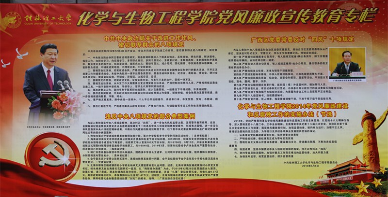 会上,梁书记和与会人员一起学习了《高等学校教师职业道德规范》、《教育部财政部关于加强中央部门所属高校科研经费管理的意见》等7个学校纪委要求学习的文件以及《桂林理工大学2014年党风廉政建设和反腐败工作实施意见》、《桂林理工大学化学与生物工程学院2014年党风廉政建设和反腐败工作实施办法》等文件,并对我院开展的相关工作进行了解读和详细布置。接着,全体参会人员观看了廉政教育片———《卡住公款送礼》。大家在整个影片播放过程中认真观看,影片结束后进行了讨论,大家认为影片贴近现实,教育意义重大。大家表示,作为高校教师,要率先垂范,做清正廉明的典范,起先锋模范作用。 此外,学院还专门制作了宣传教育专栏展板,重点宣传了《中共中央政治局关于改进工作作风、密切联系群众的八项规定》、《广西壮族自治区党委常委反对“四风”十项规定》等内容。