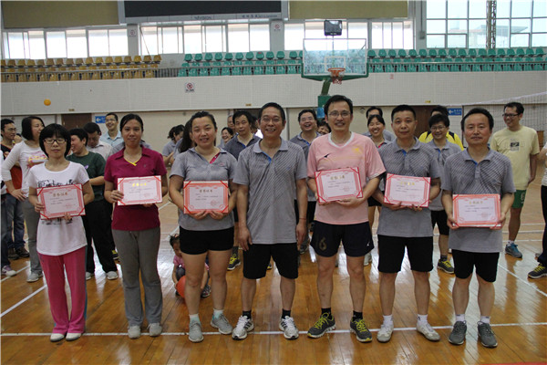 本次比赛由我院所属的各教研室、实验中心和两办(学工办、院办)人员分别组成的6支队伍参加,分淘汰赛和循环赛两个阶段进行,还特别规定了场上至少要有2名女运动员参赛。经过激烈角逐,最终决出了名次:应用化学教研室获得第一名,学工办和院办联合队、电化学教研室获并列第二名,实验中心、生物工程教研室、化学与化工教研室获得并列第三名。