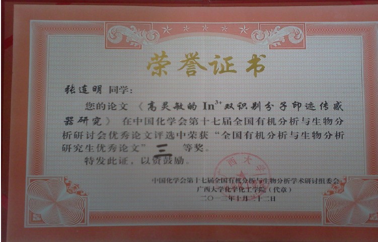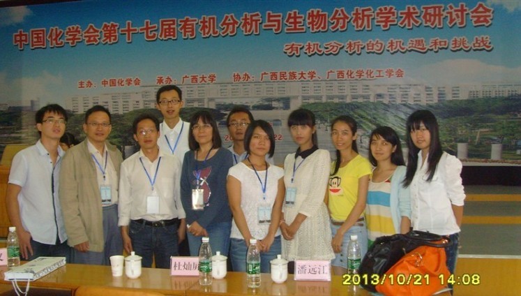 9月20日到9月22日,由中国化学会举办、广西大学承办的“第十七届中国化学会有机与生物分析研讨会”在南宁召开。张玉奎院士等国内70余所高校的200多名代表参加此次会议。我院李建平、阮贵华、杜甫佑等三位教师及部分研究生出席了此次会议。受大会组委会邀请,李建平教授做了题为“分子印迹传感器灵敏度的新策略”的分会特邀报告,引起了与会代表的极大关注。此次大会还评选出了研究生优秀论文奖,我院研究生张连明同学的论文《高灵敏的In3+双识别分子印迹传感器的研究》获得“全国有机分析与生物分析研究生优秀论文三等奖”。